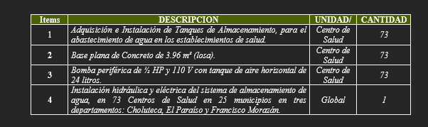 - Care Internacional en Honduras, implementadora del Proyecto SAG-PROSASUR en consorcio con Visión Mundial, invita a los licitantes elegibles a presentar ofertas en sobres sellados para el proceso: SAG-PROSASUR-SDO/FA-26-2024, para el suministro e instalación de un sistema de almacenamiento de agua en 73 Centros de Salud en 25 municipios en los Departamentos de Choluteca, El Paraíso y Francisco Morazán, que se detalla a continuación: