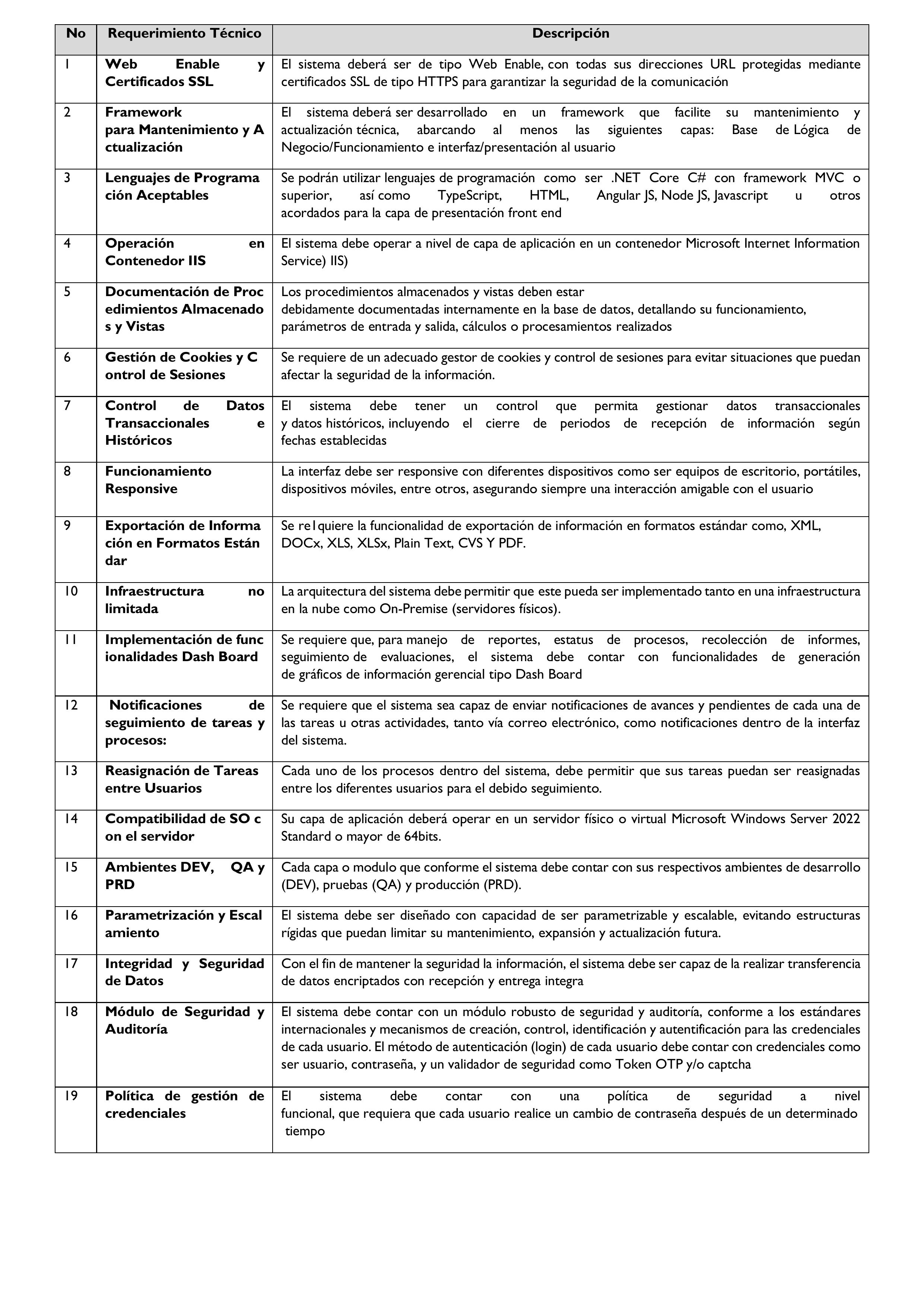 Se requiere que el sistema a desarrollar cuente con niveles de seguridad informática apropiados dada la apertura a nivel general del mismo, a la vez que su plataforma de trabajo sea moderna y ágil que responda adecuadamente a los procesos internos y externos que se desean automatizar, para lo cual se definen los siguientes requerimientos técnicos: