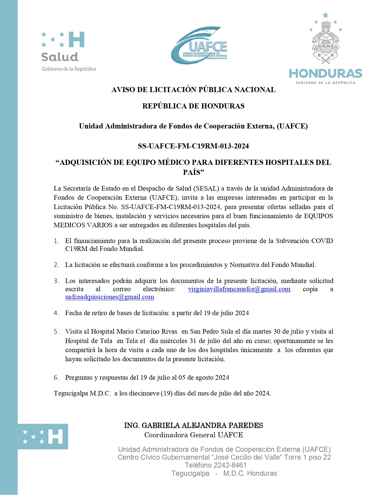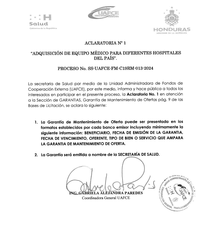 Aclaratoria No. 1, del proceso de “ADQUISICIÓN DE EQUIPO MÉDICO PARA DIFERENTES HOSPITALES DEL PAÍS” No. SS-UAFCE-FM-C19RM-013-2024