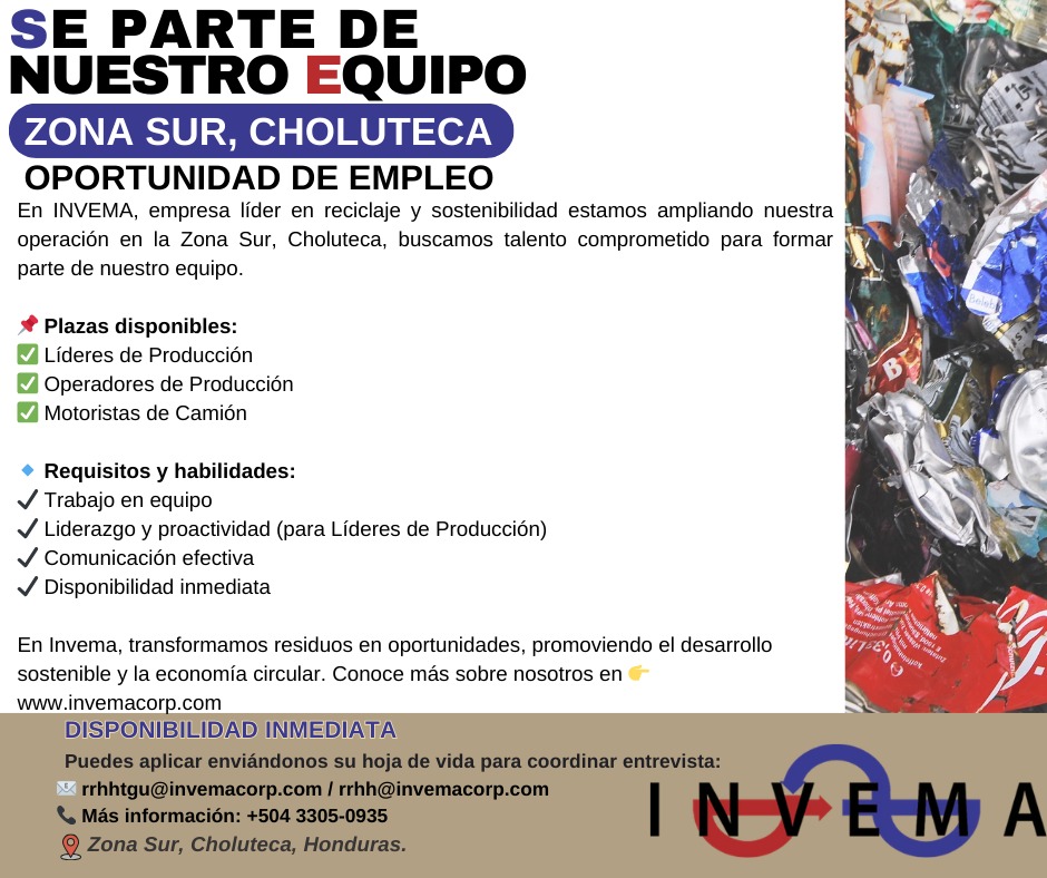 Interesados Enviar hoja de vida actualizada al correo: [email protected]colocando en el asunto el nombre de la vacante (Jefe de patio Choluteca). O contactarse al 3305-0935 para más información.