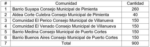Cruz Roja Hondureña en conjunto con la IFRC (Federación Internacional de Sociedades de la Cruz Roja y de la Media Luna Roja) implementan actualmente el proyecto de emergencia, “DREF-Dengue dirigido a población en situación de emergencia y vulnerabilidad en Honduras” en donde se contemplan acciones enfocadas en intervenciones directas en 6 comunidades donde actualmente tiene cobertura el proyecto DREF-en esta oportunidad la dotación de 900 tanques de 750 litros dirigido a población seleccionada en base a la necesidad de carencia de almacenamiento de agua en sus viviendas . La población destinataria son 900 familias, donde el proyecto tiene cobertura de intervención y son: Barrio Suyapa, Aldea Corte Culebra del Municipio de Pimienta, Comunidad El Perico, El Venado del Municipio de Villanueva y Barrio Medina, Barrio Buenos Aires del Municipio de Puerto Cortes.
