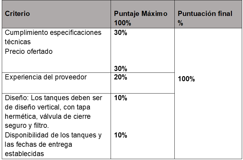 Adquisición de bienes y servicios: Compra de 900 tanques de 750 litros con sus accesorios (con una válvula de flote, una válvula de bola de salida, filtro de sedimentación no desechable y adicional acoplado una llave de plástico de chorro de media pulgada) Los tanques deben ser del material de polietileno de alta densidad).